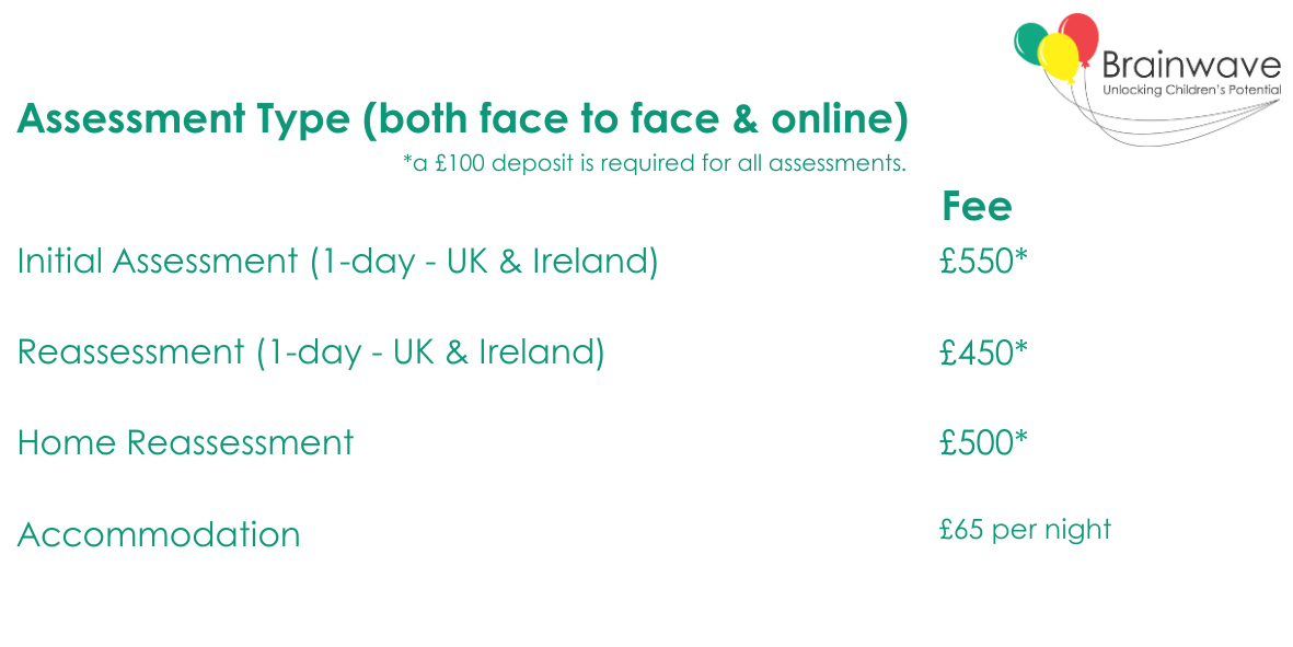 All families pay a £100 deposit for a child’s initial assessment or reassessment. This [deposit] will be taken when you book.